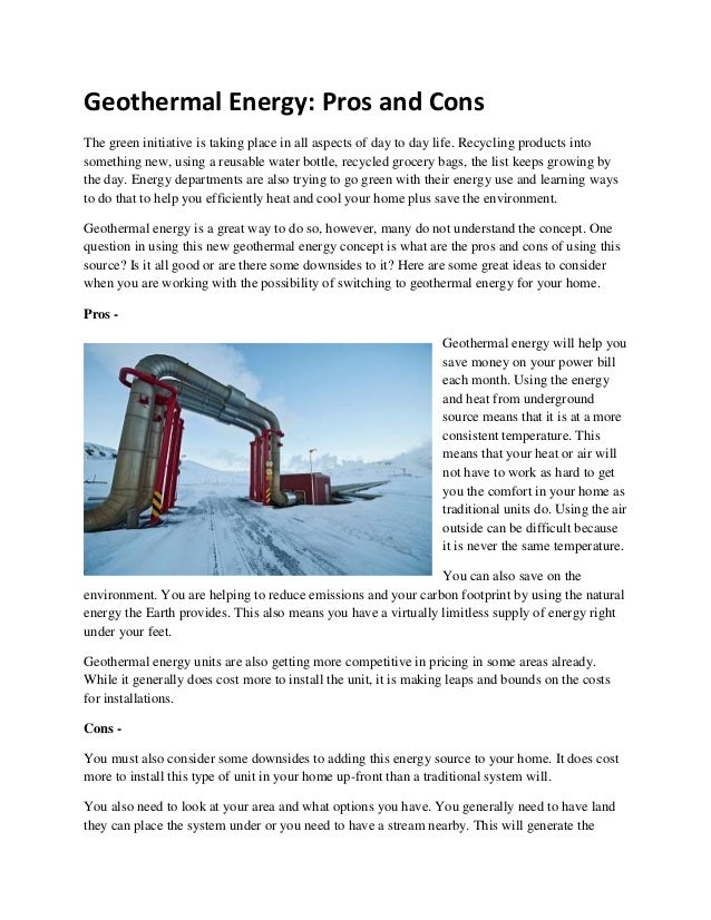 7 The pros and cons, and future of geothermal energy. It looks at the most favourable areas for geothermal exploitation, heat production, geothermal power plants and the pros, cons and future of geothermal energy. If 1000 residential units at the latitude of the UK were to have ... Document Viewer